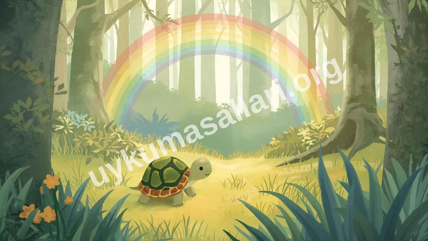 Bir gün, gölün yüzeyinde rengârenk bir yaprak süzülmüş. Yaprak, rüzgârla dans ederek Minik Kaplumbağa’nın önüne kadar gelmiş. Kaplumbağa yaprağı görünce çok merak etmiş. “Bu renkler nereden gelmiş acaba?” diye düşünmüş. Yaprak hafifçe titreşmiş, sanki “Beni takip et,” der gibi bir hâli varmış. Minik Kaplumbağa’nın içinde minik bir heyecan çiçek açmış. Gölün ötesindeki ormana doğru ilerlemeye başlamış. Minik Kaplumbağa, yavaş adımlarına rağmen içindeki merakla ilerlemiş. Ormanın girişinde ona küçük bir sincabın parlak gözleriyle gülümseyerek baktığı görülmüş. “Nereye gidiyorsun böyle?” diye sormuş Sincap. Minik Kaplumbağa, gözlerini heyecanla parlatıp “Renklerin kaynağını bulmak istiyorum,” demiş. Sincap kuyruğunu neşeyle sallamış. “Ben de sana yardım edeyim,” demiş ve ikisi birlikte ilerlemiş. Ağaçların arasından güneş ışıkları süzülmüş, kuşlar tatlı melodilerle şarkılar söylemiş. Derken, karşılarına uçuşan minik beyaz tüyleri olan bir kelebek çıkmış. “Aradığınız şeye yaklaşmışsınız,” demiş kelebek incecik sesiyle. Minik Kaplumbağa, içini ısıtan bu ilgiyle kendini çok mutlu hissetmiş. Yolculuk boyunca arkadaşlarının yanında olmasının onu cesaretlendirdiğini fark etmiş. Bir süre sonra, ormanın içindeki açık bir alana gelmişler. Tam ortada büyük bir gökkuşağı yere doğru eğilmiş gibi duruyormuş. Renkler minicik çiçeklerin üzerine düşmüş, her çiçek başka bir renkle parlıyormuş. Minik Kaplumbağa büyüyen gözlerle etrafa bakmış. “Demek renkler buradan geliyormuş…” diye fısıldamış. Gökkuşağı sanki bu fısıltıyı duymuş, ışıkları hafifçe titremiş. Kaplumbağa, rüzgârın getirdiği sıcak bir fısıltıyla “Her renk arkadaşlıkla çoğalıyor” kelimelerini duyunca gülümsemiş. Sincap ve kelebek de yanında durup onunla birlikte bu güzelliği izlemiş.